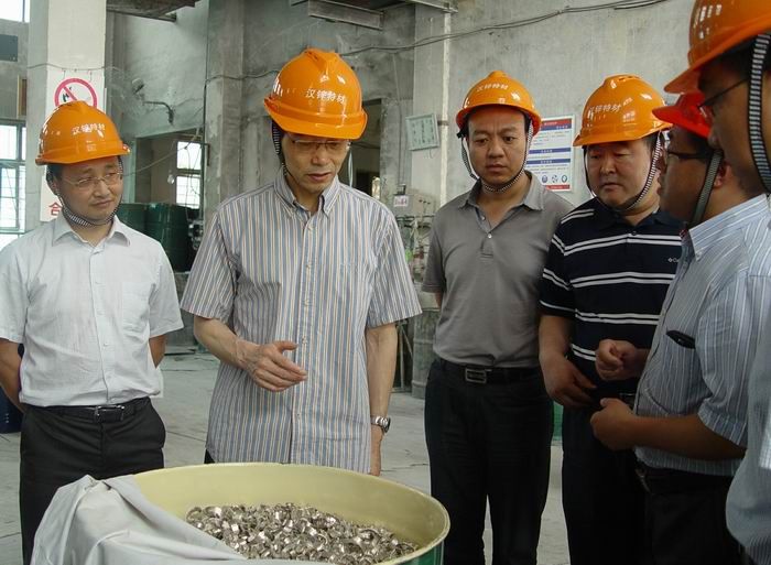 省國資委黨委副書記何少華(左二)集團(tuán)組織部長汪小明(左一)聽取金屬鈣產(chǎn)品介紹