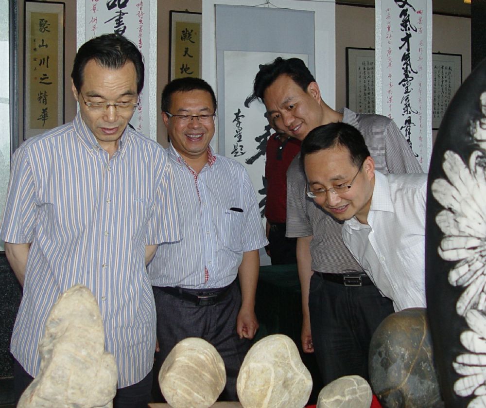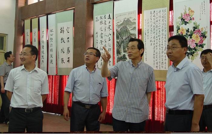 省國資委黨委副書記何少華(左三)集團(tuán)組織部長汪小明(左一)參觀職工書畫展品